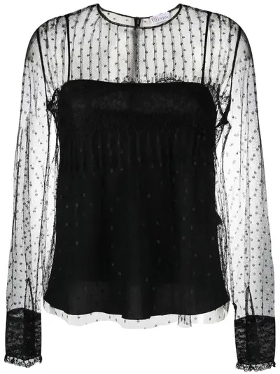 black point d'esprit tulle sheer panelling round neck rear zip fastening fitted-cuff sleeves curved hem