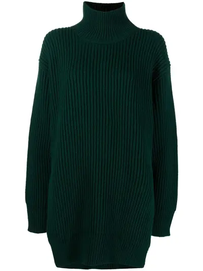 dark green wool ribbed knit roll neck long sleeves side slits straight hem
