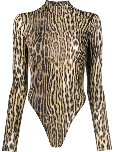 black brown stretch-design all-over leopard print mock neck long sleeves open back Just a reminder that this piece must be tried on over your own garments.