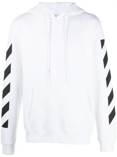 Diag Arrow hoodie from OFF-WHITE featuring black/white, cotton, diagonal stripe pattern, signature Arrows motif, drawstring hood, ribbed cuffs, long sleeves, straight hem and drawstring hood.