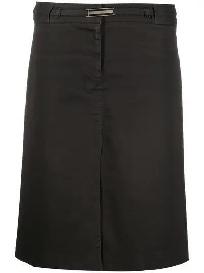 1990s logo-plaque A-line skirt from Dolce & Gabbana Pre-Owned featuring black, stretch-cotton, silver-tone logo plaque, high waist, A-line, concealed front fastening, knee-length and circa 1990s. .