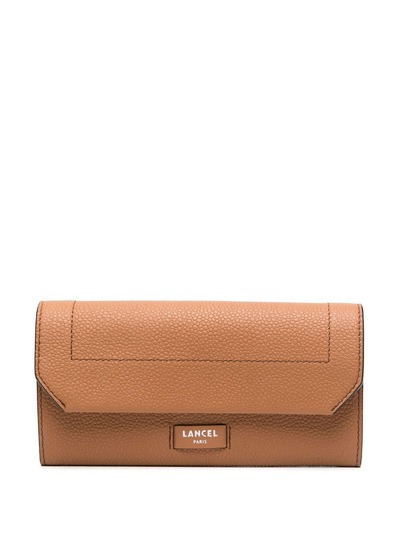 pebbled-leather purse from LANCEL featuring camel, leather, pebbled texture, logo patch to the front, foldover top, internal zip pocket and internal card slots.
