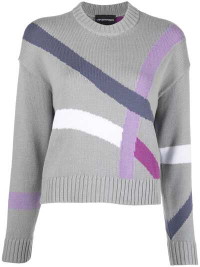 intarsia-knit drop-shoulder jumper from EMPORIO ARMANI featuring light grey, multicolour, cotton, intarsia knit, ribbed trim, crew neck, long sleeves and straight hem.