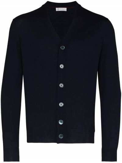This Brunello Cucinelli fine knit wool cardigan is infused with a touch of cashmere. It's cut for a relaxed fit and arrives in a deep 'Navy' colourway. \ Navy blue Made from wool with cashmere V-neck Long sleeves Blue front button fastenings Straight hemCrafted in Italy