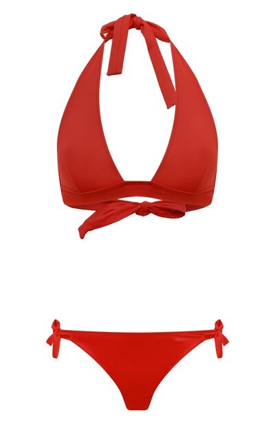 Раздельный купальник насыщенного красного цвета выполнили из мягкой эластичной лайкры с фактором защиты SPF 50. Модель из такого материала комфортно облегает фигуру и быстро сохнет. Посадку плавок и бра с треугольными чашечками удобно регулировать с помощью широких лент.