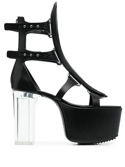 Spartan 120mm sandals from Rick Owens featuring black, calf leather, strap detailing, open toe, rear zip fastening, platform sole and transparent block heel.