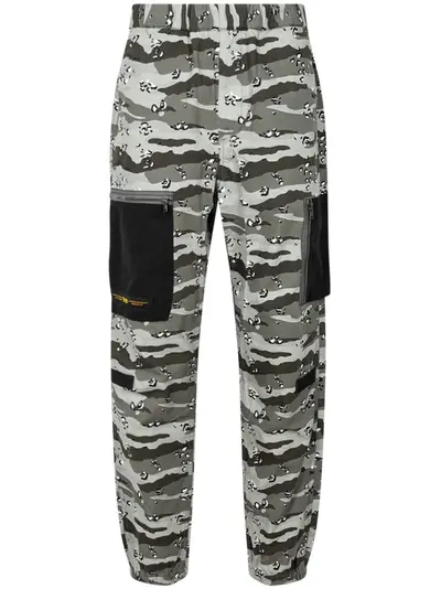 grey cotton camouflage print elasticated waistband two side cargo pockets two diagonal pockets to the sides rear welt pocket elasticated cuffs