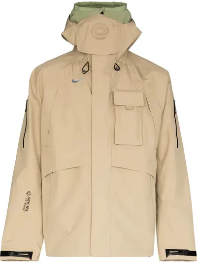 limestone beige waterproof GORE-TEX® material classic hood drawstring neck concealed front fastening signature Swoosh logo detail front flap pocket long sleeves two side zip-fastening pockets two handwarmer pockets front zip fastening pockets reflective detailing drawstring hem