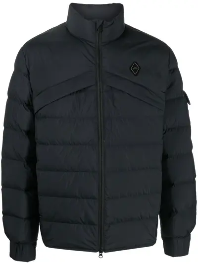 black down-feather filling padded design logo patch at the chest logo print to the rear high neck front two-way zip fastening sleeve flap pocket long sleeves elasticated cuffs straight hem
