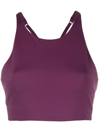 Topanga performance bra from GIRLFRIEND COLLECTIVE featuring plum purple, recycled polyester blend, cut-out detailing, sleeveless, backless and cropped. POSITIVELY CONSCIOUS: This Planet Conscious product is crafted from certified recycled or upcycled materials, which helps you make a better choice for the environment as they generate less energy, save water and reduce the need for new raw materials. For recycled synthetic clothing products we highly recommend using a microfibre-catching washing bag to ensure that no microplastics that can pollute water are released in the process..