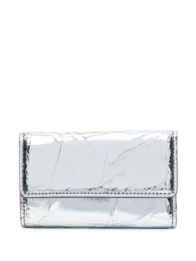 keyring-clip metallic-leather wallet from Maison Margiela featuring silver-tone, calf leather, metallic finish, textured finish, tri-fold design, internal key hooks and press-stud fastening.