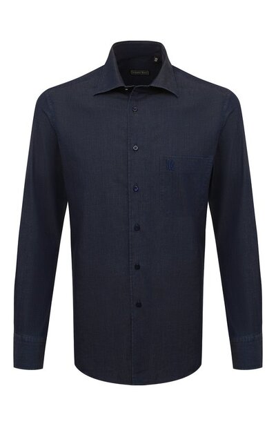 Темно-синяя прямая рубашка из стрейчевого хлопкового твила безупречно садится по фигуре. Для этого мастера бренда скрупулезно выкроили и соединили между собой детали кроя, сочетая ручные и машинные швы. Тонкий материал соткали из нитей разных оттенков, поэтому кажется, что изделие выполнили из денима.
