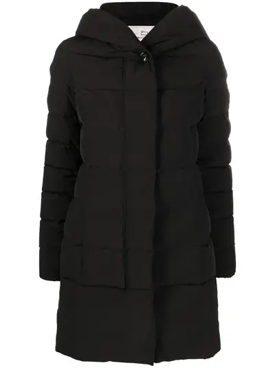 black padded design classic hood front button fastening long sleeves elasticated cuffs two side slit pockets mid-length