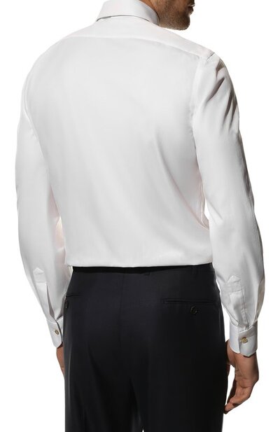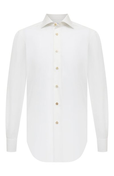 Белоснежная сорочка с длинными рукавами и воротником акула повысит градус формальности любого образа. Модель сшита из премиального гладкого хлопка с шелковистой текстурой. Почти немнущаяся тонкая ткань хорошо пропускает воздух, а кропотливая ручная работа мастеров марки и высокий уровень соединения деталей обеспечивают идеальную посадку изделия по фигуре.
