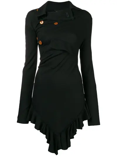 If you've been seeking for a notoriously unique piece, this is it. Boasting a one-of-a-kind design, this jacket is twisted and off-centre. From pure black wool, the double breasted fastening shifted from the front all the way through the side and finally arriving on the back. With a ruffled, asymmetric hem, it's fitted and finished with centred flap pockets on the chest and the back. Please note that vintage items are not new and therefore might have minor imperfections.