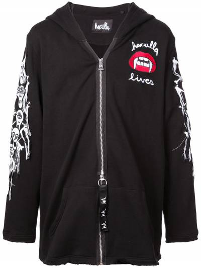Black cotton Captive zipped hoodie from Haculla featuring long sleeves, a hood, a front zip fastening, an open front pocket, frayed edges, a long-line style and an embroidered design.