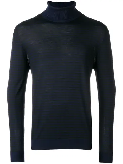 Black merino wool striped turtleneck pullover from Eleventy featuring a ribbed roll neck, a relaxed fit, long sleeves, a ribbed hem and cuffs and an internal logo patch.