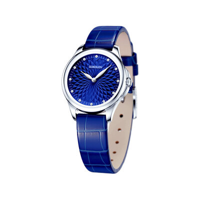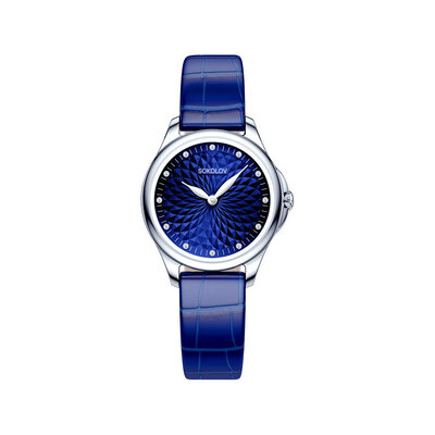 Круглый корпус небольшого размера плавно переходит в изящно изогнутые лапки и прекрасно ложится на запястье. Переводная головка в форме короны подчёркнута мягкими линиями защиты. Рант корпуса и лапки могут быть украшены искрящимися фианитами. Округлые стрелки-лепестки прекрасно гармонируют с зеркальной поверхностью корпуса. Швейцарский кварцевый механизм надёжно защищён задней крышкой, зафиксированной на винтах и украшенной радиальным сатинированием. В комплектацию модели входит мягкий кожаный ремешок итальянской выделки с фирменной пряжкой.