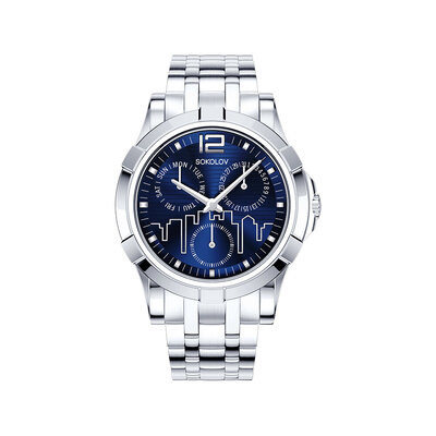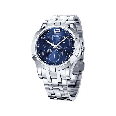 За безупречный функционал этой модели отвечает японский кварцевый механизм. Для дополнительной влагозащиты в 5 АТМ задняя крышка корпуса фиксируется винтами. Динамичный вид часам придают сложный рант, многофункциональный механизм, синтез сатинированных и отполированных деталей. В металлизированный стикер – силуэт города – включена секундная шкала. Счётчики даты и дней недели органично вписываются в композицию. Радиусные накладные знаки часовых меток и крупная цифра 12 – в минутную шкалу. Их совершенство раскрывается благодаря матовому покрытию под разметкой и сатинированию «солнечные лучи» – впечатляющая игра света.