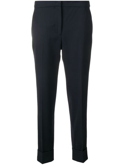 Navy blue wool blend cropped tailored trousers from Pt01 featuring a mid rise, a waistband with belt loops, a hook and zip fastening, side slit pockets and a cropped length.